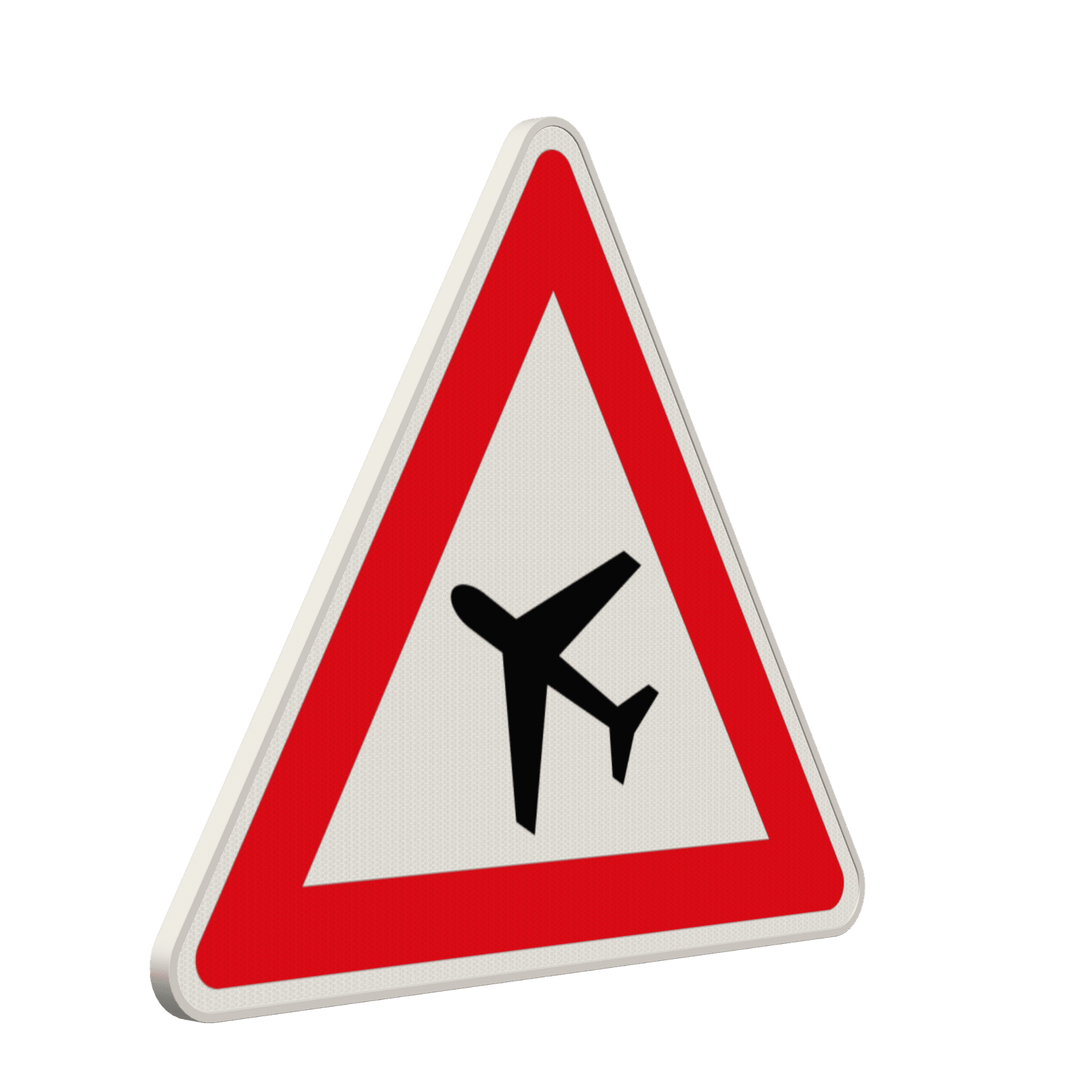 Das Verkehrsschild 101-10 "Flugbetrieb, Aufstellung rechts" warnt vor plötzlichem Fluglärm und Schattenwurf durch niedrig fliegende Flugzeuge.