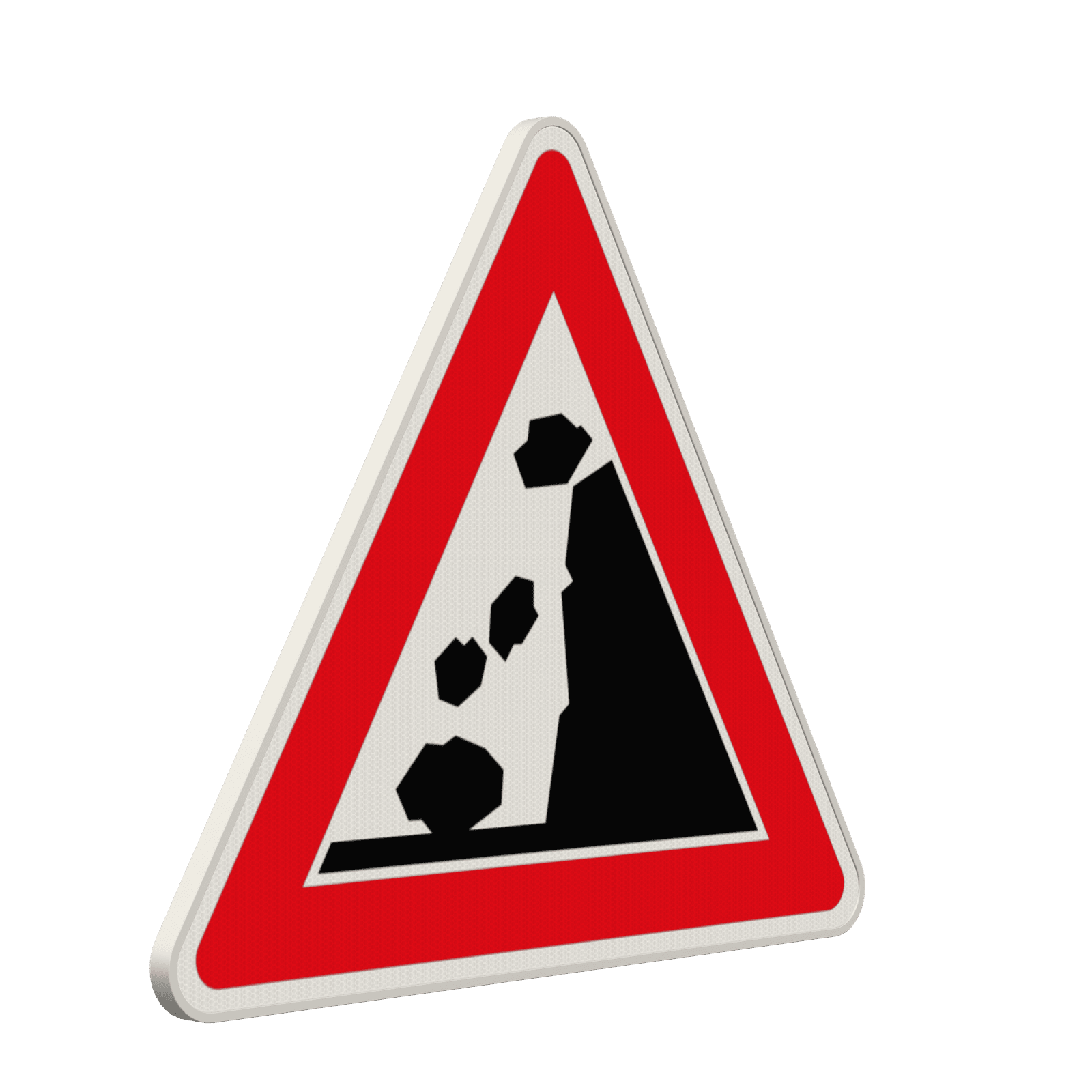 Das Gefahrenzeichen warnt vor herabfallenden Steinen, die auch auf der Fahrbahn liegen können.