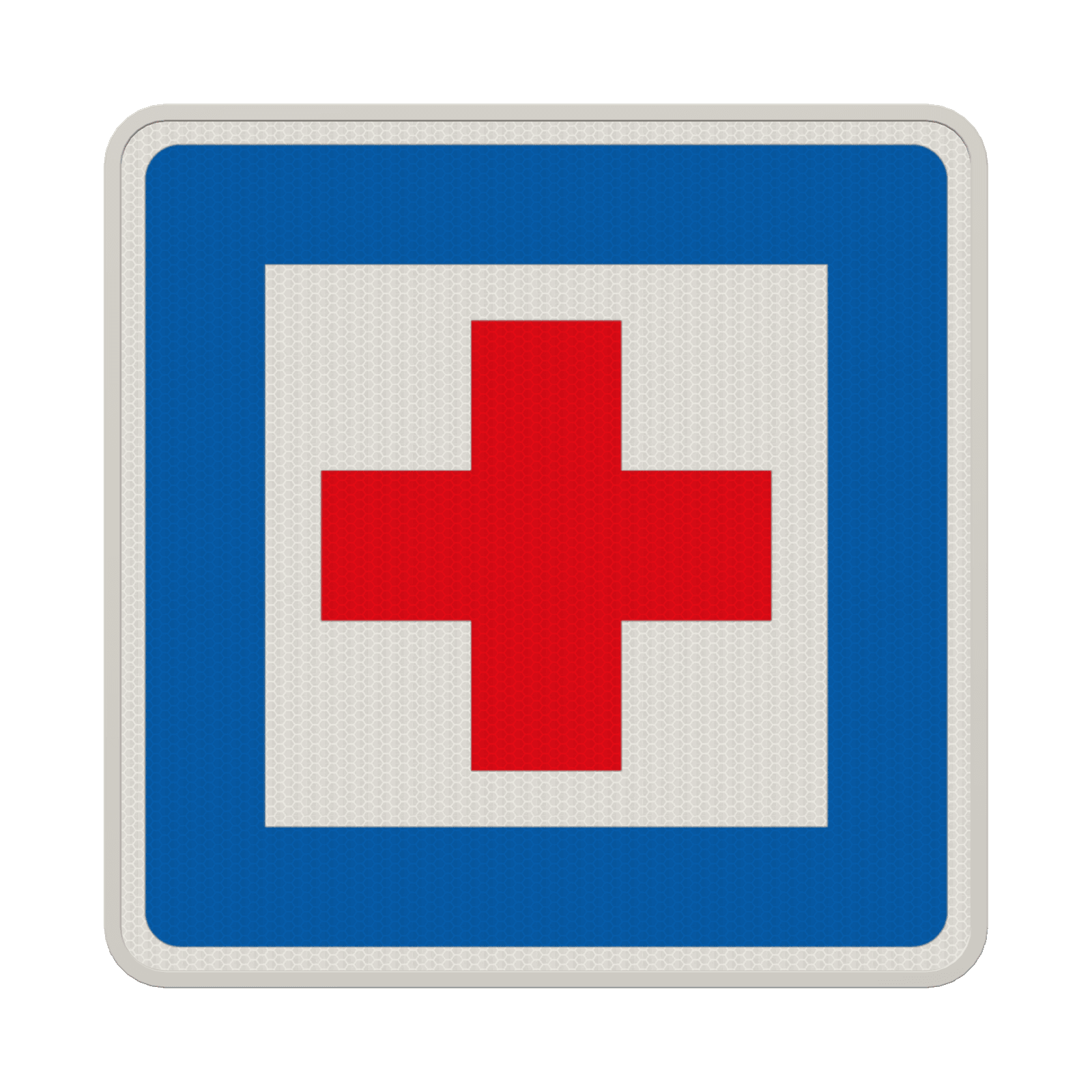 Dieses Schild ist ein blaues Quadrat mit einem großen, roten Erste Hilfe Zeichen (rotes Kreuz) in der Mitte.