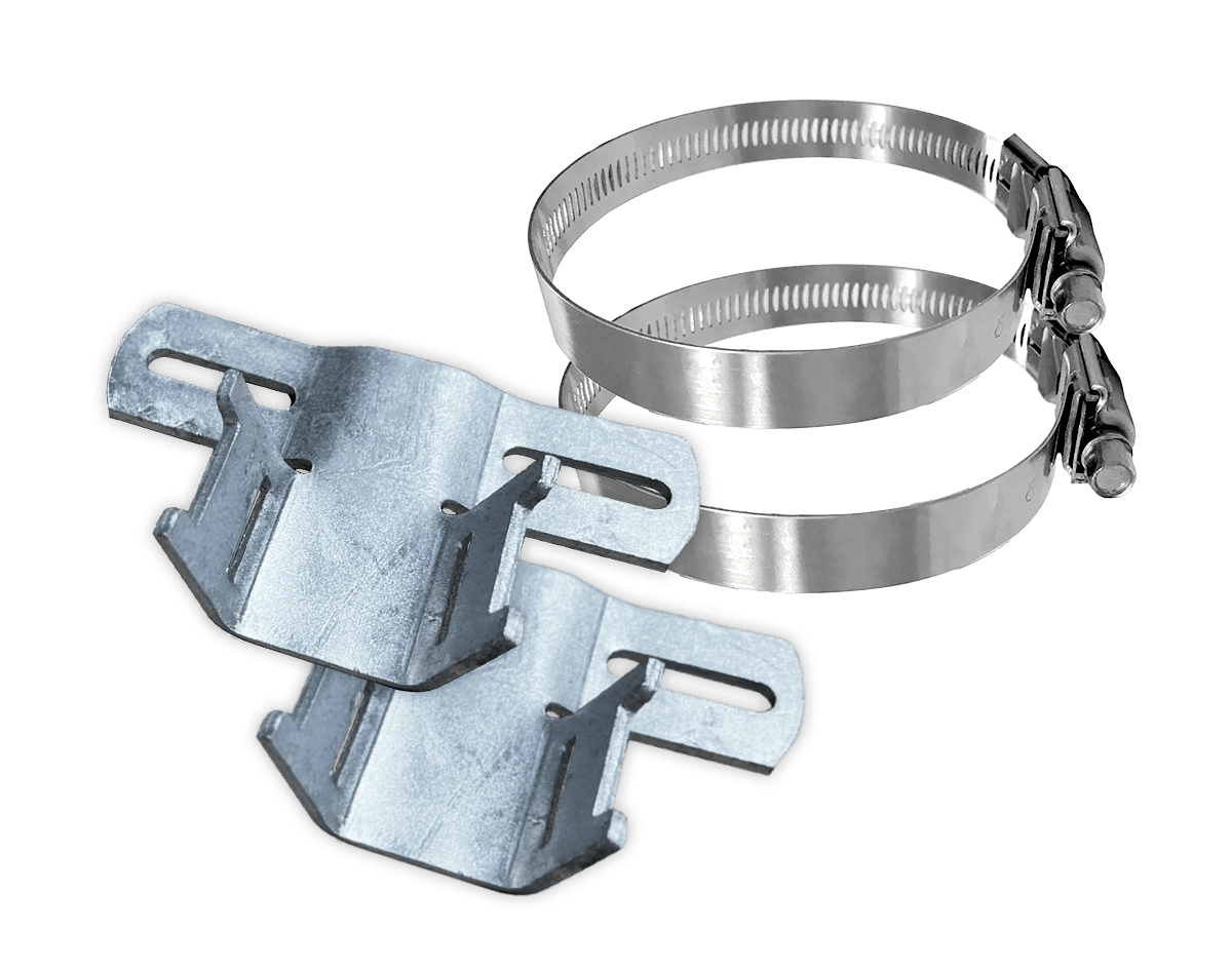 Ein verstellbares Halterungsset mit einem Edelstahl-Klemmband zur Montage eines flachen Verkehrsschildes an einem bestehenden (Laternen-)Mast mit einem variablen Durchmesser von ø 32 mm bis ø 384 mm.