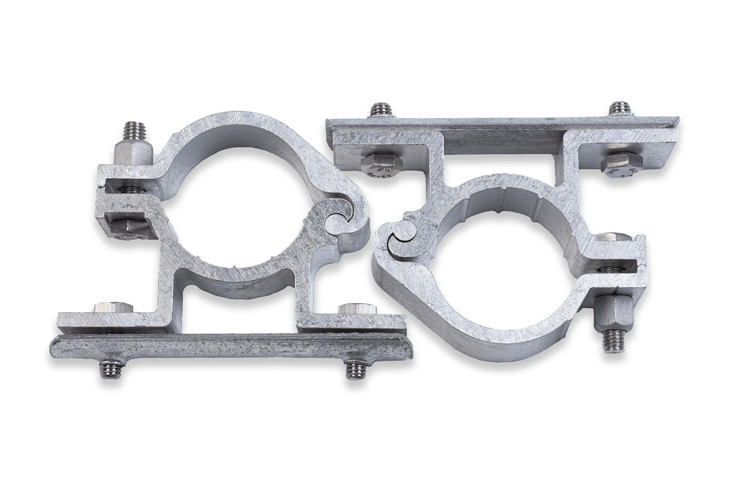 Aluminium Rohrschellen Ø48mm (Set aus 2 Stück) mit Edelstahlschrauben und -muttern. Seit Jahren die zuverlässigste Lösung für die Halterung von Verkehrsschildern (typ Alform) an einem Pfosten mit einem Durchmesser von Ø48mm.
